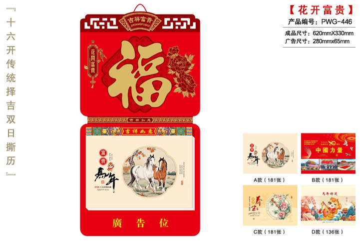 本厂有着一流的印刷设备,根据市场变化不断地对产品进行更新换代,2026年共推出皱油水晶七彩工艺卡纸挂历、小对开铜版卡纸挂历、环保新款大花边卡纸挂历系列等共计200多个产品,从小号便签精品周历到大班商务新概念周历,从国际时尚特大四开卡纸挂历到欧版横翻铜版卡纸吊历,产品涵盖高中低档,价格从2-3元到十几元不等,满足不同层次不同领域的客户需求。我们希望以优秀的技术、热情的服务和有保障的产品质量,能让您选择"我们"信赖"我们",让我们成为您更安全、更方便、更快捷、更放心的合作伙伴从而共创双赢的合作未来!